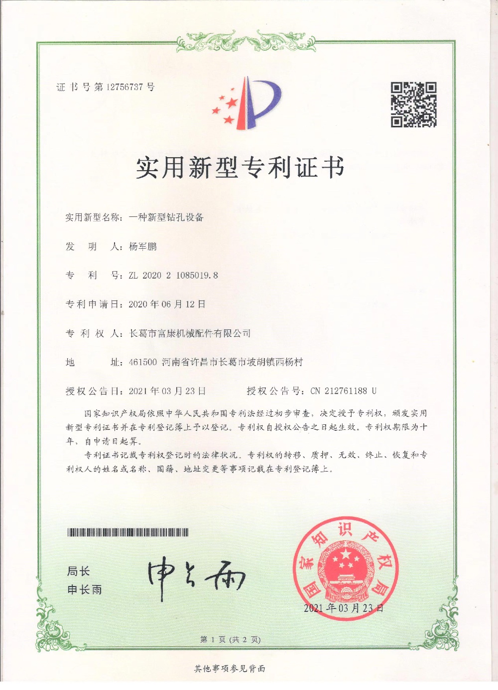 下一条信息:实用新型专利证书